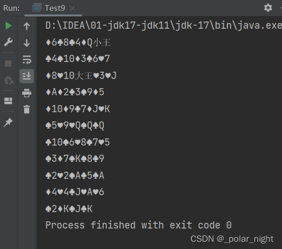 public class Test9 {public static void main(String[] args) {//创建colours,numbers,cards数组String[] colours = {"♥", "♠", "♦", "♣"};String[] numbers = {"2", "A", "K", "Q", "J", "10", "9", "8", "7", "6", "5", "4", "3",};String[] cards = new String[54];cards[0] = "大王";cards[1] = "小王";//循环迭代 出一整副牌int count = 2; //因为大小王占了两个索引,重新定义索引for (int i = 0; i < numbers.length; i++) {for (int j = 0; j < colours.length; j++) {cards[count] = colours[j] + numbers[i]; //牌索引要从2开始count++;}}//洗牌,就是循环索引一个数与随机索引的数进行交换Random random = new Random();for (int i = 0; i < cards.length; i++) {int number = random.nextInt(cards.length);String temp = cards[i];cards[i] = cards[number];cards[number] = temp;}//输出并换行for (int i = 0; i < cards.length; i++) {System.out.print(cards[i]);if ((i + 1) % 5 == 0) {System.out.println();}}}