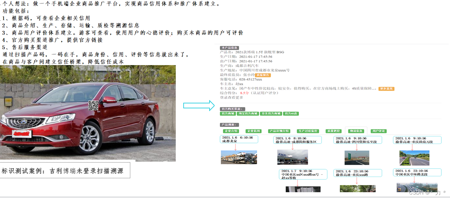 但是,通过汽车企业构建企业级节点生态链,将企业自身内部信息进行打通(原材料、供应商、生产、存储、质监、运输、售后等商品全生命周期环节的信息系统数据),潜在用户 就只需要通过扫码方式、拍照方式,就能获得该车详细信息。包括但不限于:生产商信息、生产信息、原材料信息、材料供应商信息、质监信息、运输信息、存储信息、售后信息、评价信息、官方购买渠道、打折信息等。