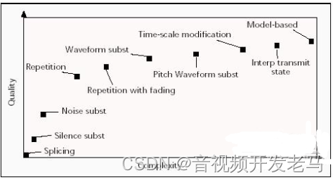 要获得好的丢包补偿效果就必须采用复杂的算法。上图显示了各种错误隐蔽算法的复杂度和质量对应关系,可以根据需要采用。比如带有衰减的包重复法是一种折衷方案。