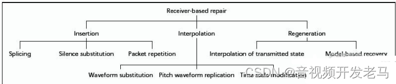 静音置换法(Silence substitution):该方法在丢包处加入静音,这样保持了语音的时钟顺序。它只有在很小的包大小(<4ms)和很低的丢包率(<2%)是有效的。随着包大小的增加,他的性能明显下降,到40ms的包大小就完全不能接受了。