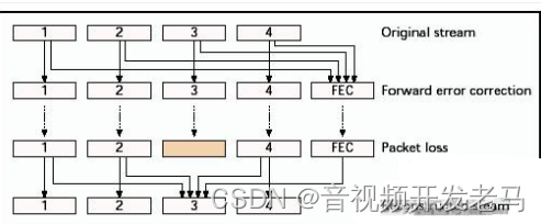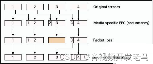 一种简单的抗丢包方式是,采用多个包传送同样的音频单元。一旦丢了一个,信息可以从另外一个包含该单元的恢复出来。图3表示了媒体相关前向差错纠正的原理。