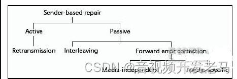 丢包补偿技术可以分为两类:基于发送端补偿和基于接受端补偿。基于发送端补偿包括前向差错纠正、交织和重传技术;基于接受端补偿包括了多种错误隐蔽算法。