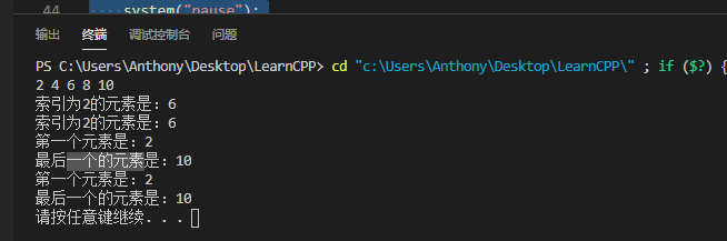 {// vector存取操作vector vec;// 1 尾部插入元素vec.push_back(2);vec.push_back(4);vec.push_back(6);vec.push_back(8);vec.push_back(10);printVector(vec); // 根据索引查找对应得数据cout << "索引为2的元素是:" << vec.at(2) << endl;cout << "索引为2的元素是:" << vec[2] << endl;// 获取第一个和最后一个元素cout << "第一个元素是:" << vec.at(0) << endl;cout << "最后一个的元素是:" << vec[vec.size()-1] << endl;cout << "第一个元素是:" << vec.front() << endl;cout << "最后一个的元素是:" << vec.back() << endl;}int main()
