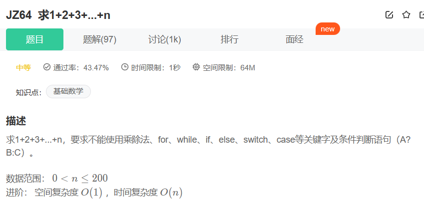 public:int Sum_Solution(int n){Sum a[n];return Sum().GetRet() - (n + 1);}