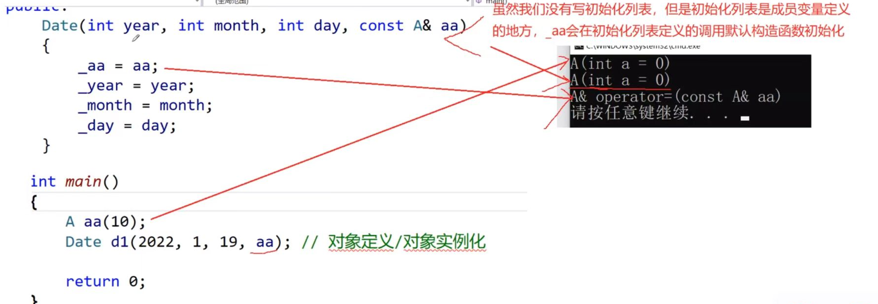 Date(int year=0, int month=1, int day=1){_year = year;_month = month;_day = day;} e、如果类中没有显式定义构造函数,则C++编译器会自动生成一个无参的默认构造函数,一旦用户显式定义编译器将不再生成。