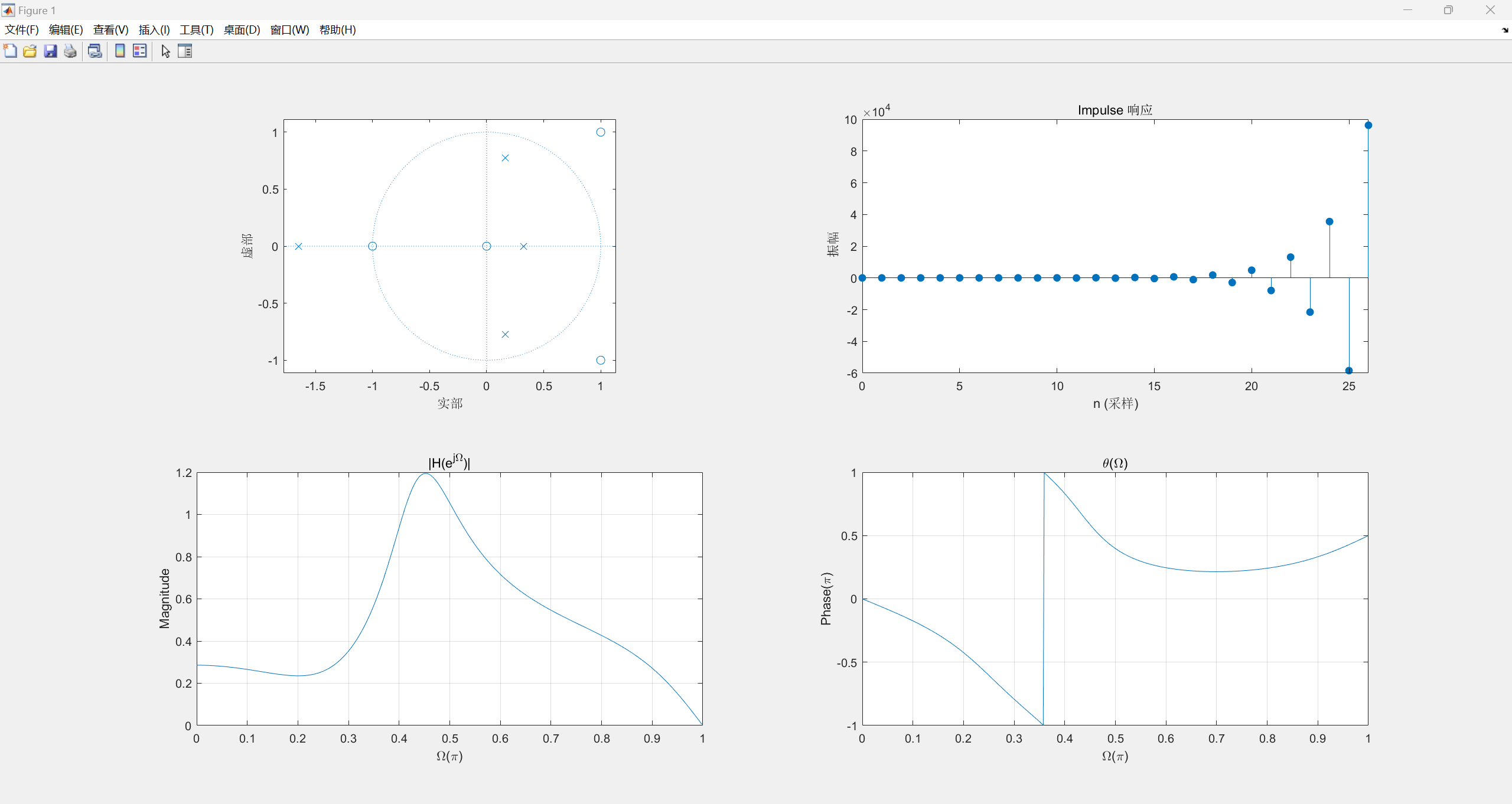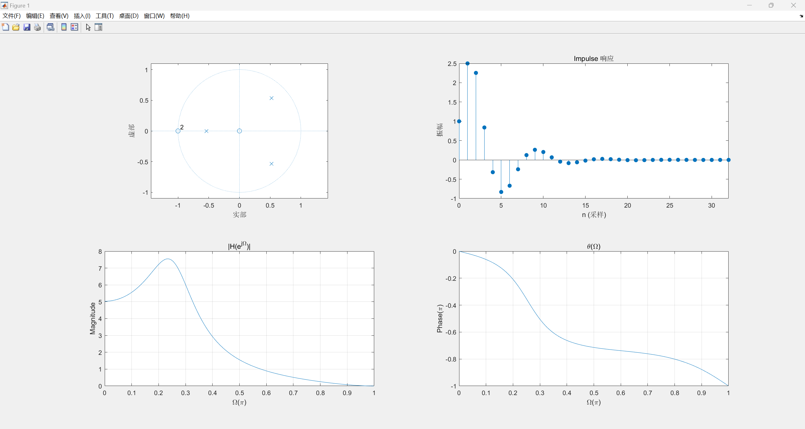 对于 H ( z ) = z ( z − 2 ) ( z − 0.8 e j π 6 ) ( z − 0.8 e − j π 6 ) H(z) = \frac{{z(z - 2)}}{{(z - 0.8{e^{j\frac{\pi }{6}}})(z - 0.8{e^{ - j\frac{\pi }{6}}})}} H(z)=(z−0.8ej6π)(z−0.8e−j6π)z(z−2),结果如下: