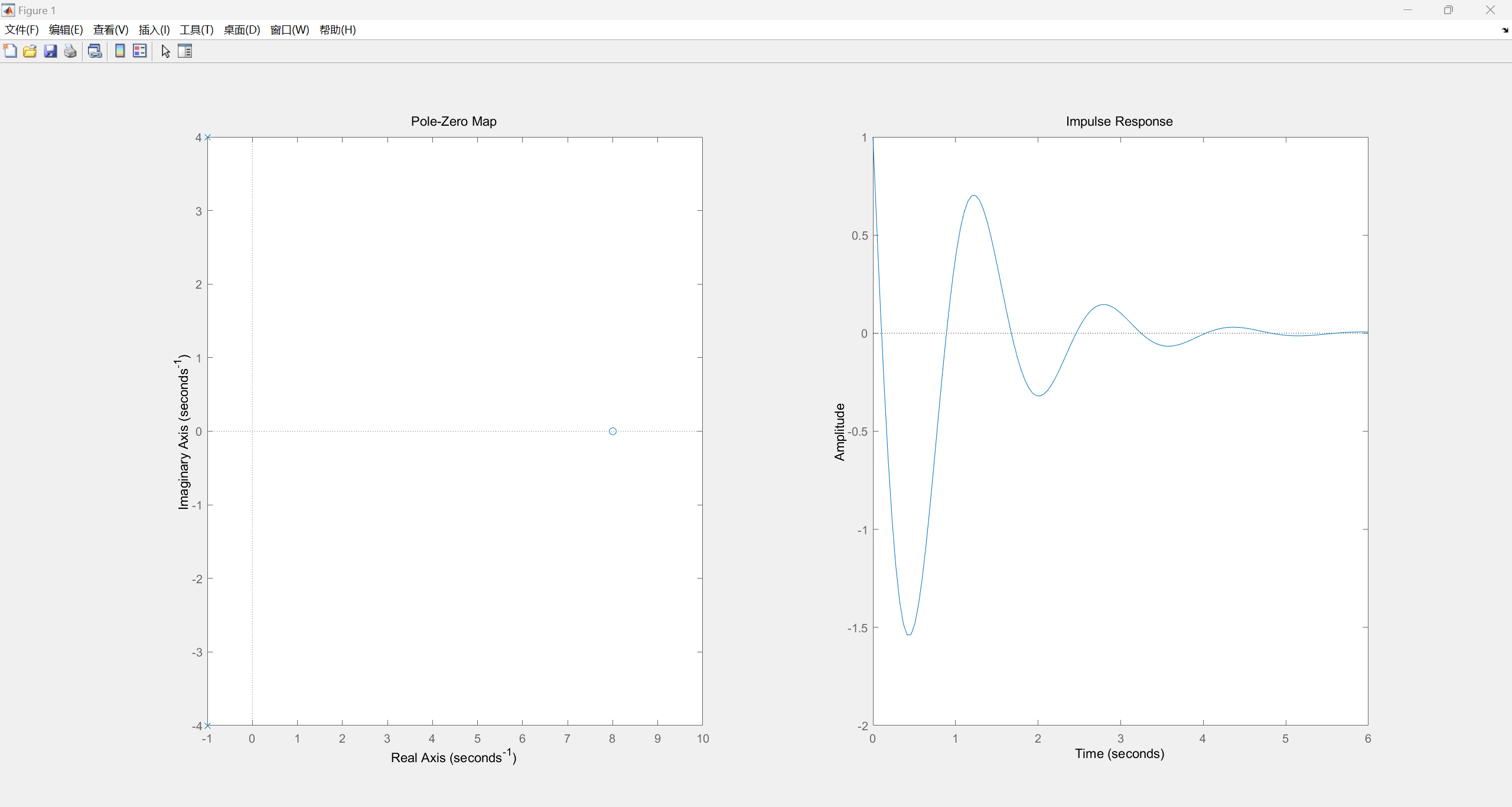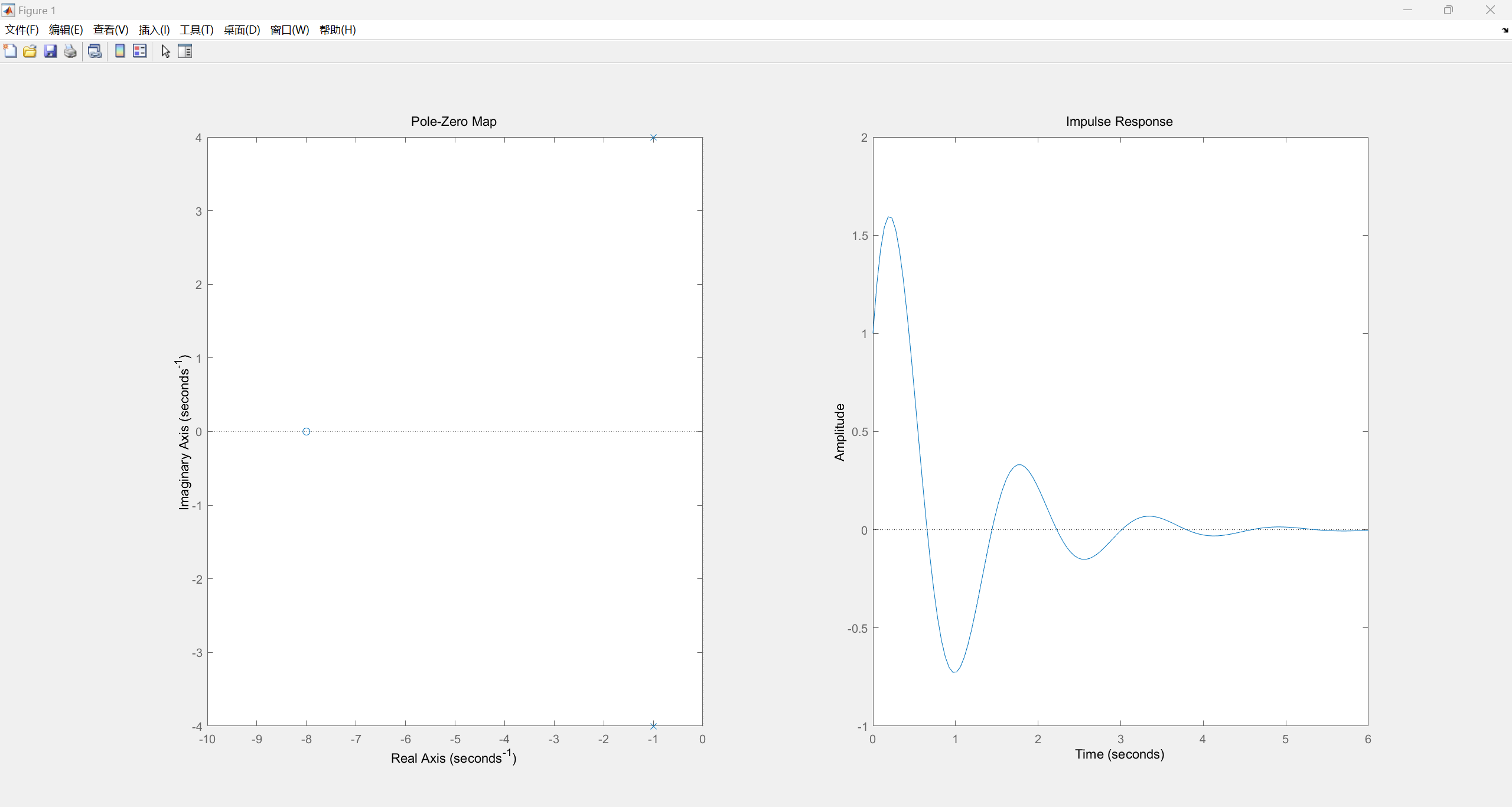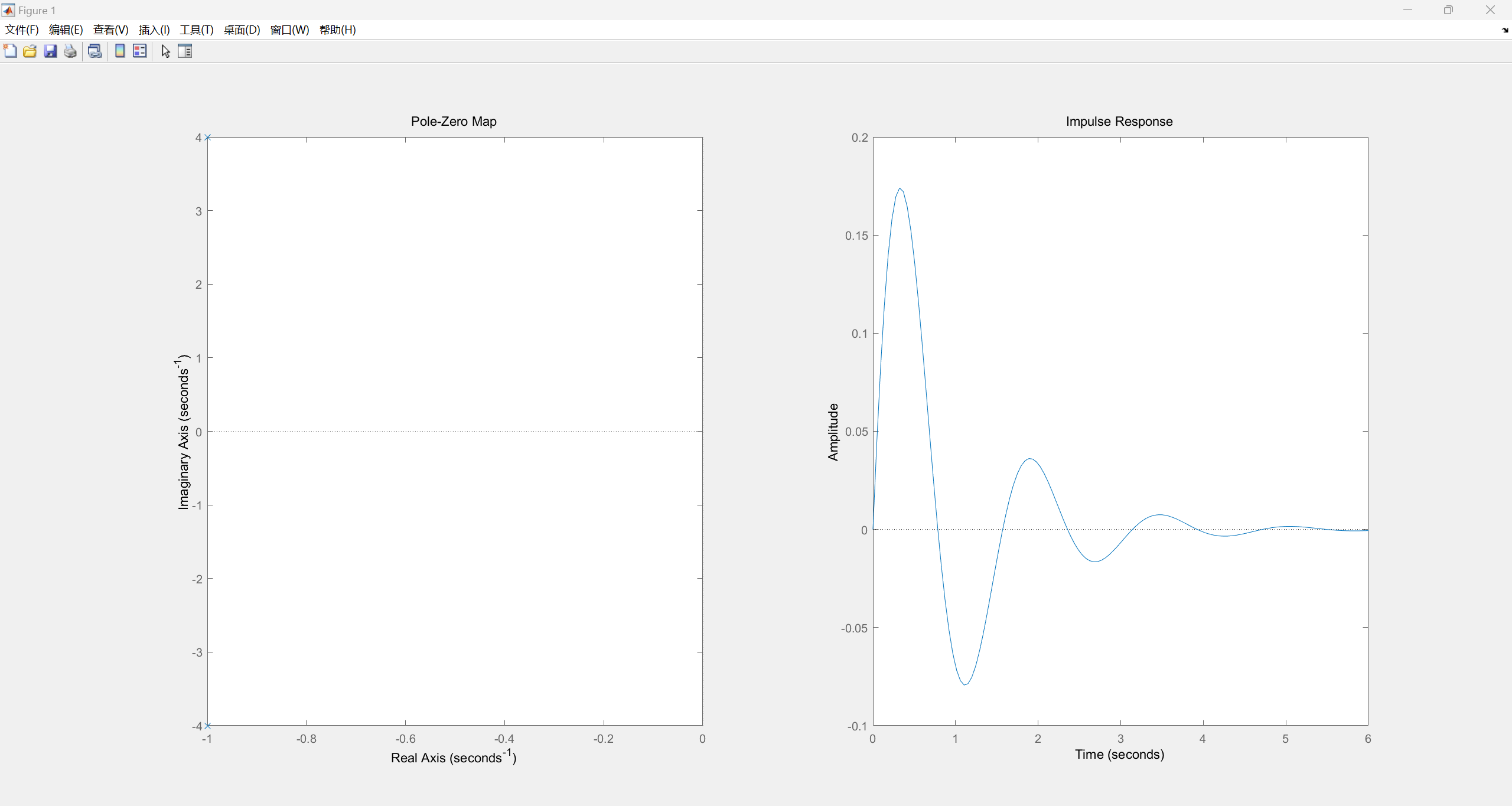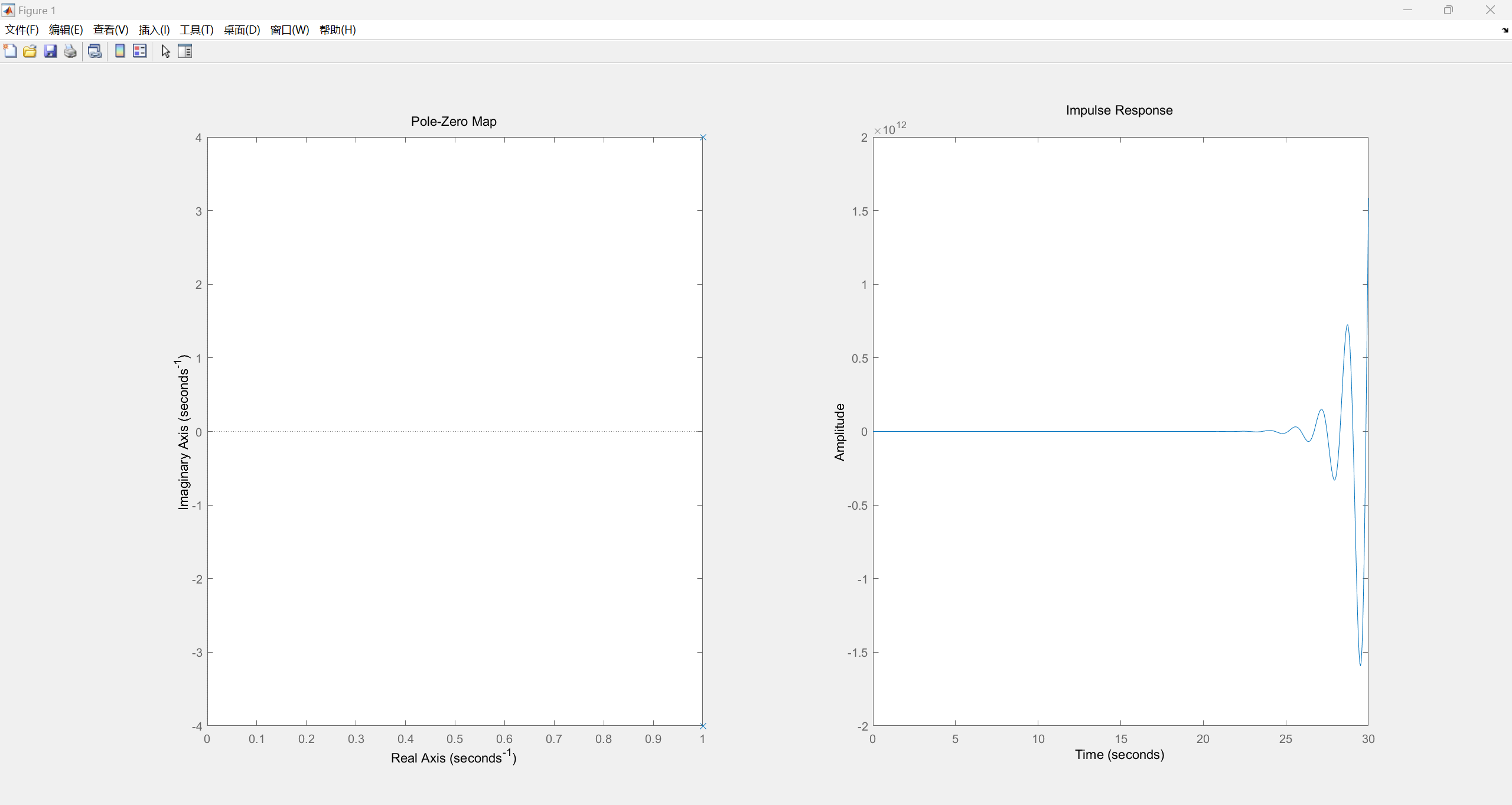 观察上述零极点分布以及相应冲激响应波形可以看出,当极点位于坐标轴左半平面时,冲激响应绝对可积,系统稳定;反之则冲激响应发散,系统不稳定。