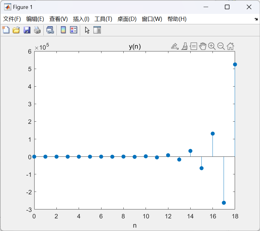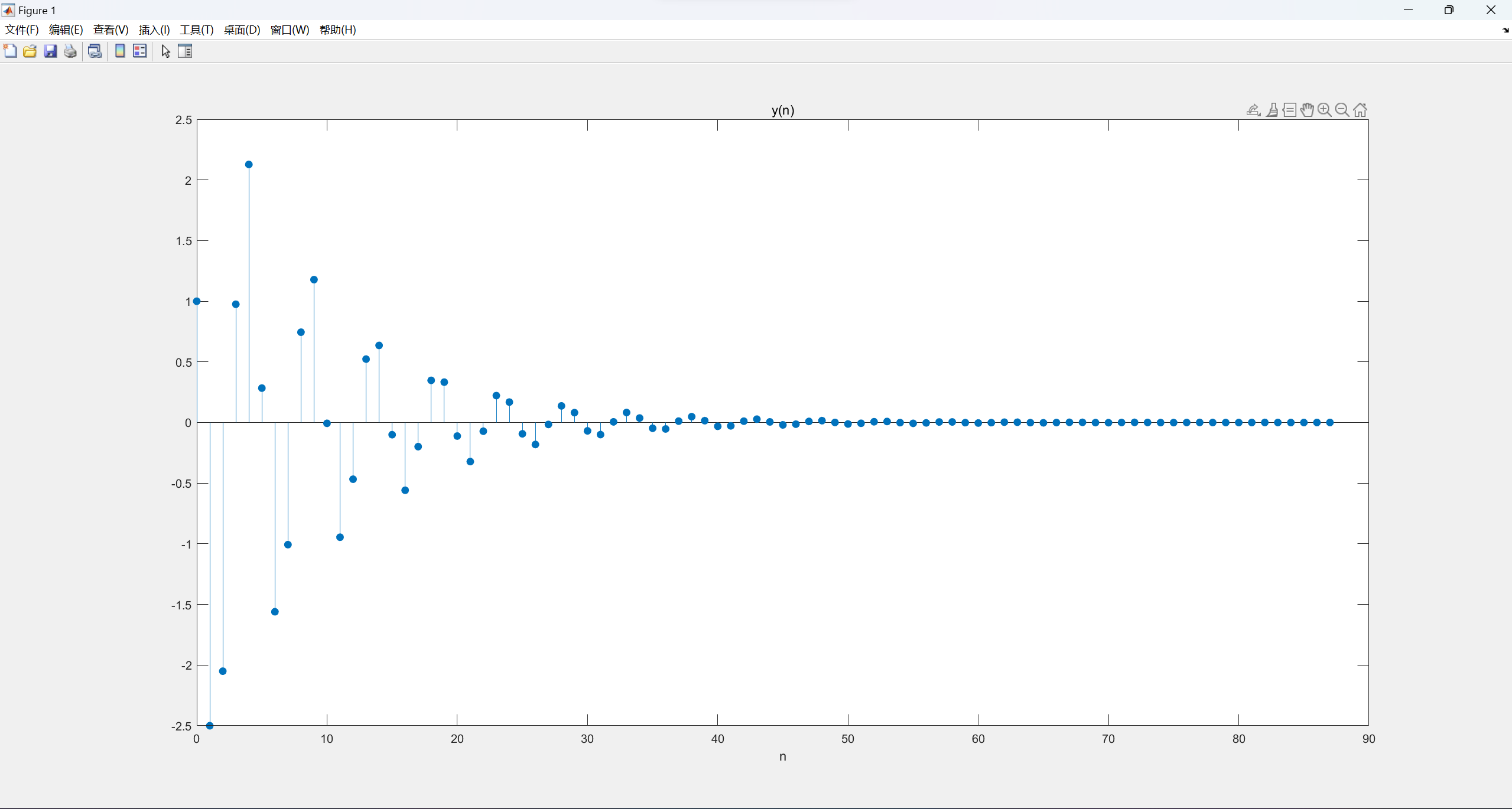 观察上述图像可以发现,当极点位于单位圆内,单位抽样序列收敛,绝对可和,当极点在单位圆上,单位抽样序列不收敛也不发散;当极点在单位圆外,单位抽样序列发散。
