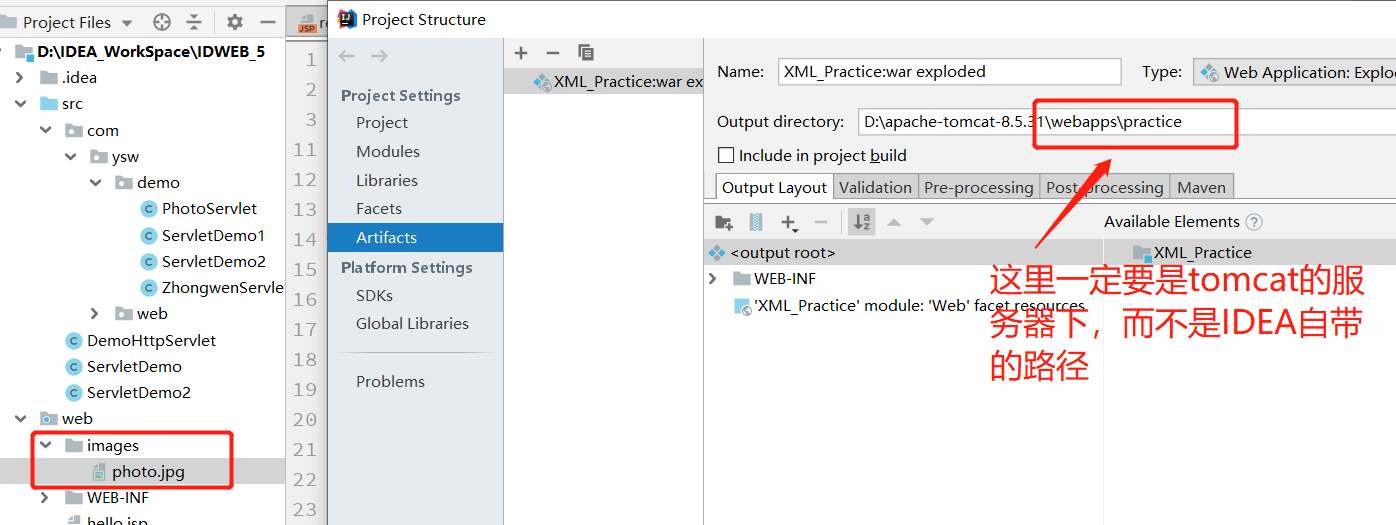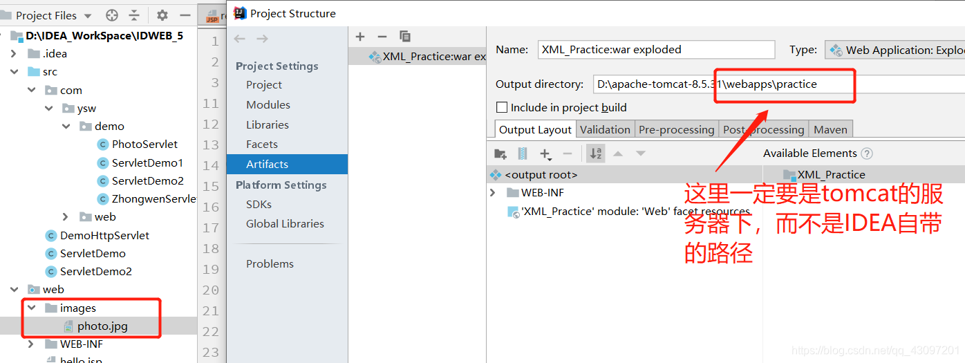 这里使用IDEA环境的话,一定要记得配置IDEA的服务器到Tomcat的WebApp目录下,详情如图所示: