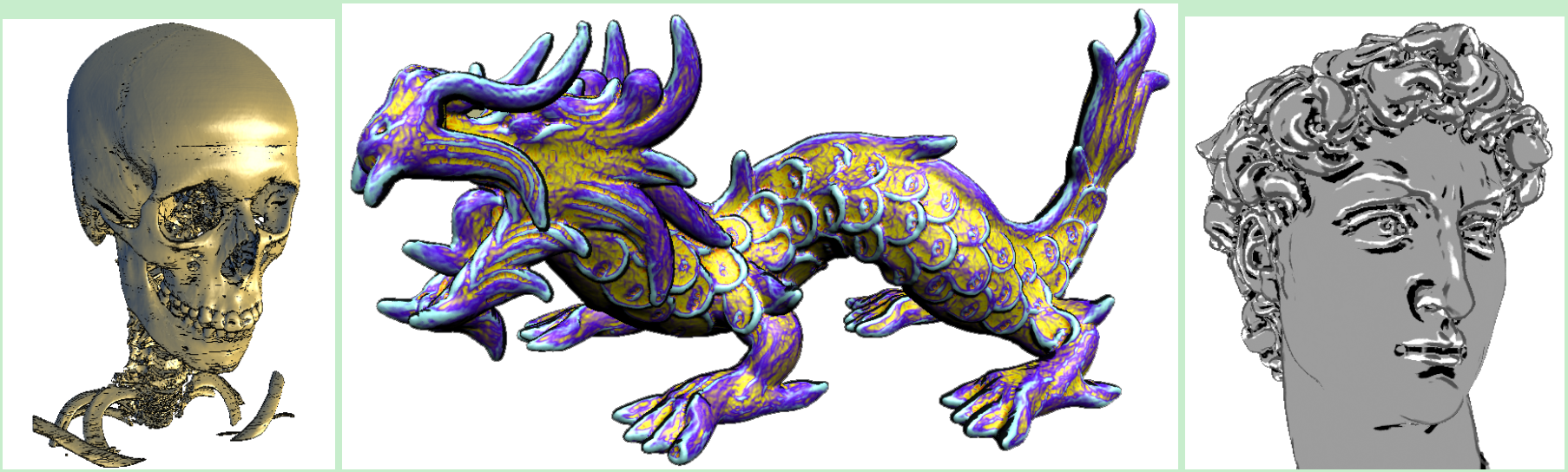 图1:我们在常规网格(例如距离场或医学CT扫描)上实时渲染高质量的隐式曲面,而不预先计算每个体素的附加信息。使用三立方滤波精确计算出具有C1连续性、二阶导数和曲面曲率的梯度。应用包括表面询问和可视化水平面计算的颜色映射曲率测量(中心),以及山脊和山谷线(左和右)。