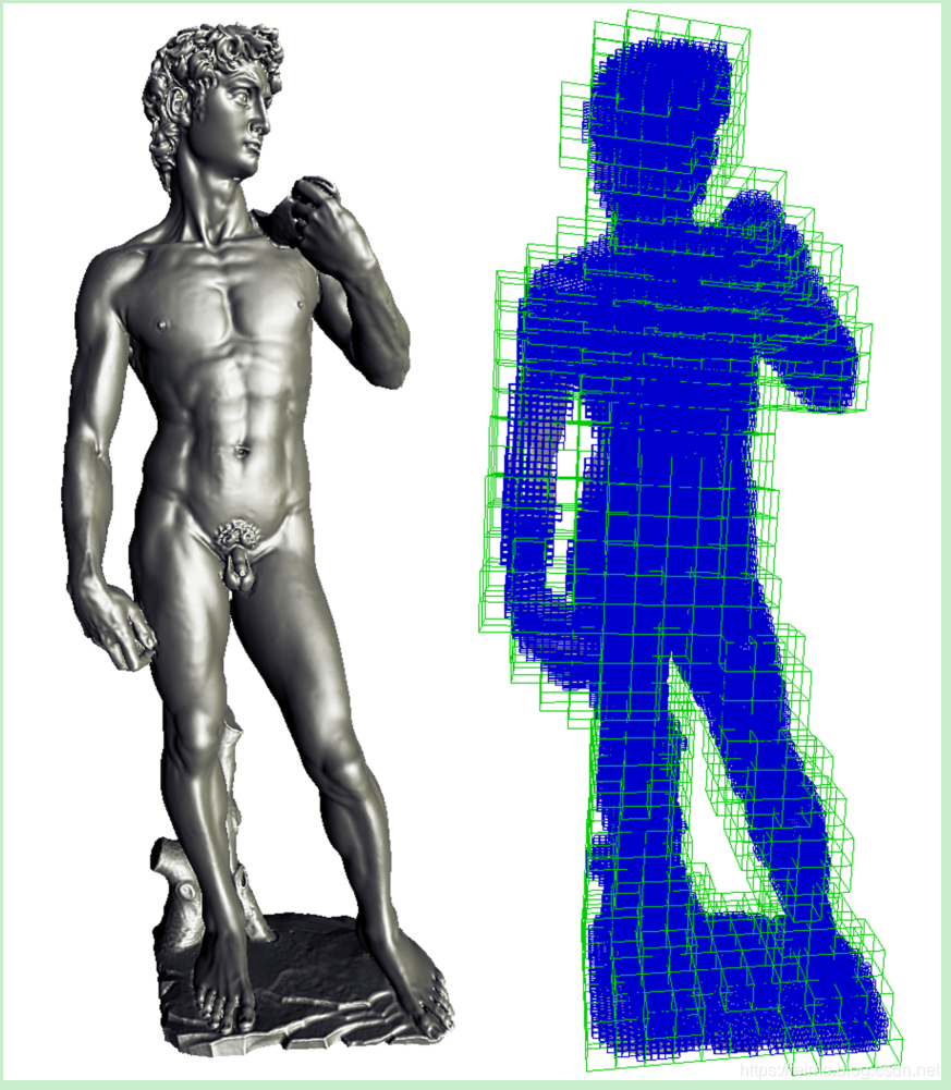图2:米开朗基罗的大卫提取和阴影三立方过滤作为一个576x352x1536 16位距离场在10 fps等表面。“距离”字段细分为两个级别:光线投射期间空空间跳跃的精细级别(蓝色)和纹理缓存的粗糙级别(绿色)。