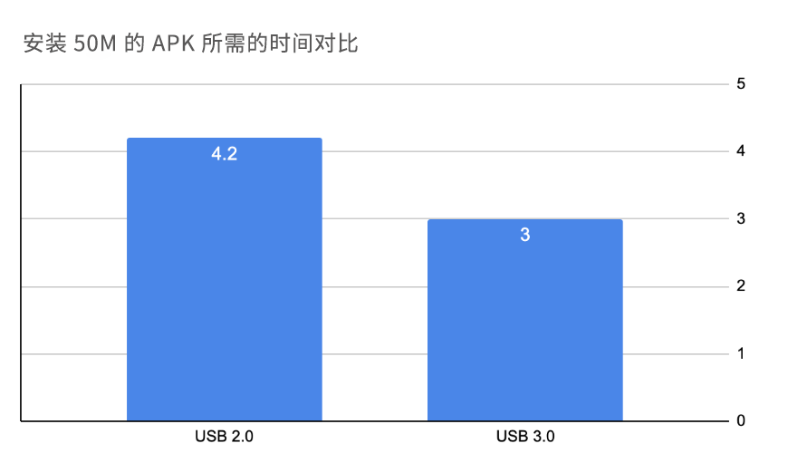 对开发者来说,拥有高速的 USB 传输至关重要。传输速度达到一定程度以后,USB 传输速度和程序迭代速度就会关联起来,手机存储的写入速度可能无法达到 USB 3.2 的 20Gb/s,不过还是比 USB 2.0 要快,所以如果您安装调试一个 50M 大小的 APK,USB 3.0 协议的传输速度会比使用 USB 2.0 协议快 25%,一天下来能节省下的时间应该不少: