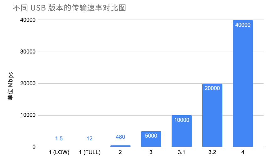 △ 从 1996 到 2019,USB 传输速率从 1.5Mbps 提高到了 40GBps