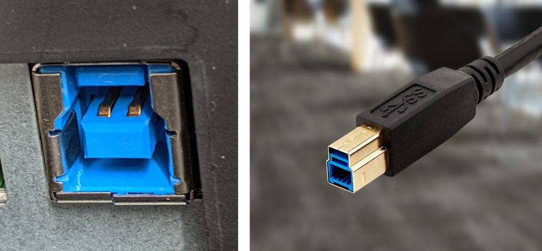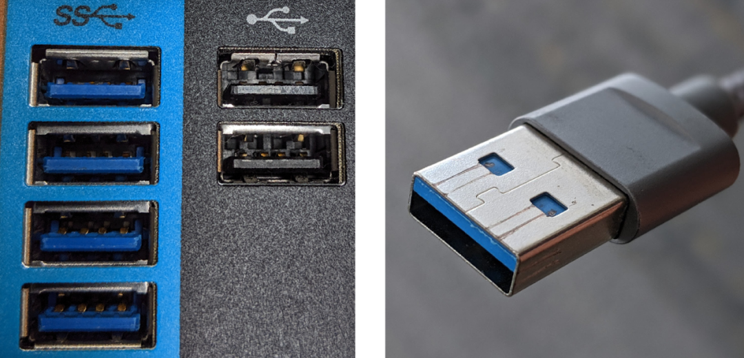 如果您用的是 Type-A 或者 Type-B 接口,那就简单了。USB 3.0 标准里建议通过颜色来区分专门连接到 USB 3.X 硬件的接口。如果您看到下面图片中的接口,那么说明您接对接口了。