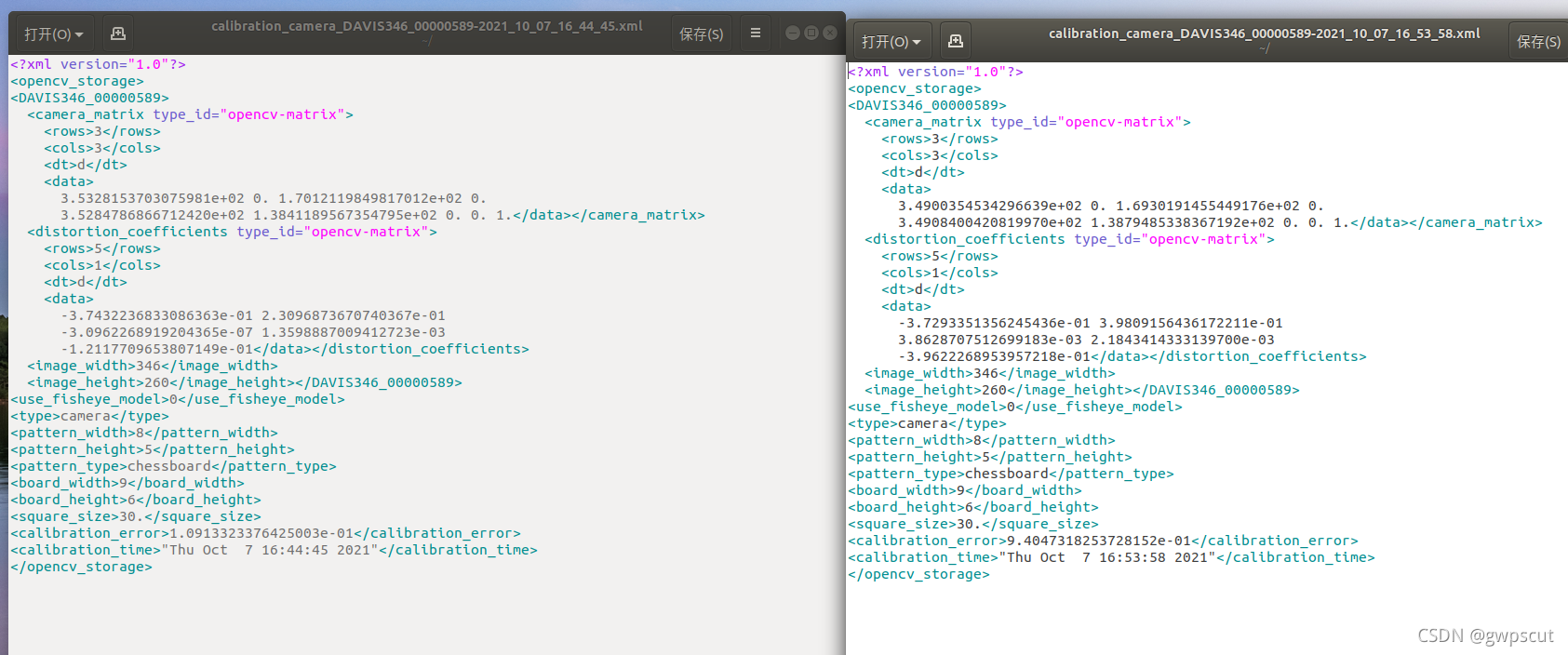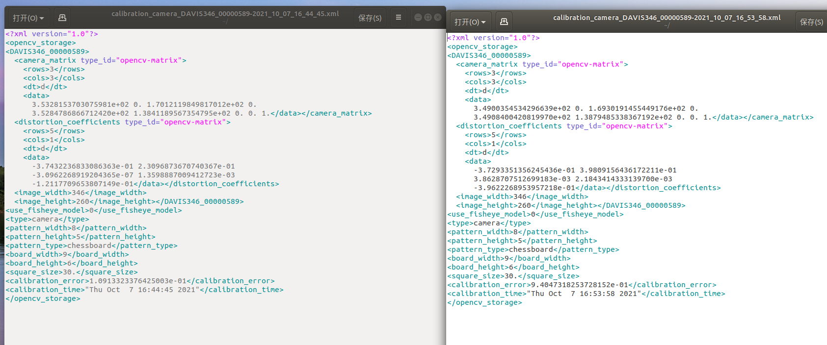 满足30张后,DV软件会进行自动标定。标定结果为.xml格式的文件,打开后即有所标定相机的参数,包括内参矩阵参数、畸变系数参数、标定误差、相机分辨率等信息。如下所示: