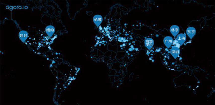 声网Agora服务覆盖200+地区,图中标注城市为声网办公室所在地