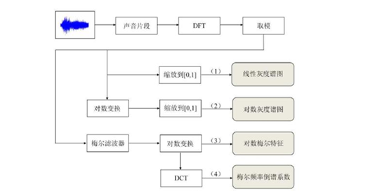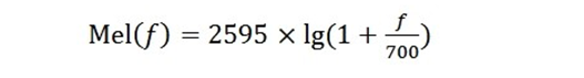 在语音识别中常用到频域特征梅尔倒谱系数(Mel-scaleFrequency Cepstral Coefficients,MFCC)特征,基于对人耳听觉研究发现,人耳对不同频率信号敏感度不同,在1000Hz以下,与频率成线性关系;反之,与频率成对数关系。因此,引入Mel频率,Mel频率与实际的频率关系。