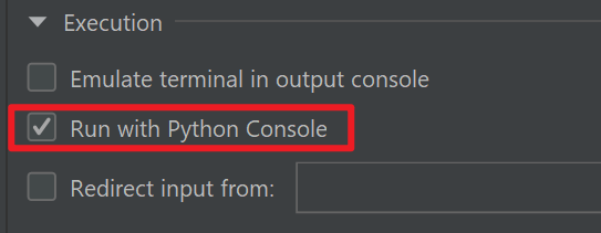 2、在对应项目的设置里勾选上 Run with Python console(这里是新版本,旧版本此选项改为“Show command line afterwards”)