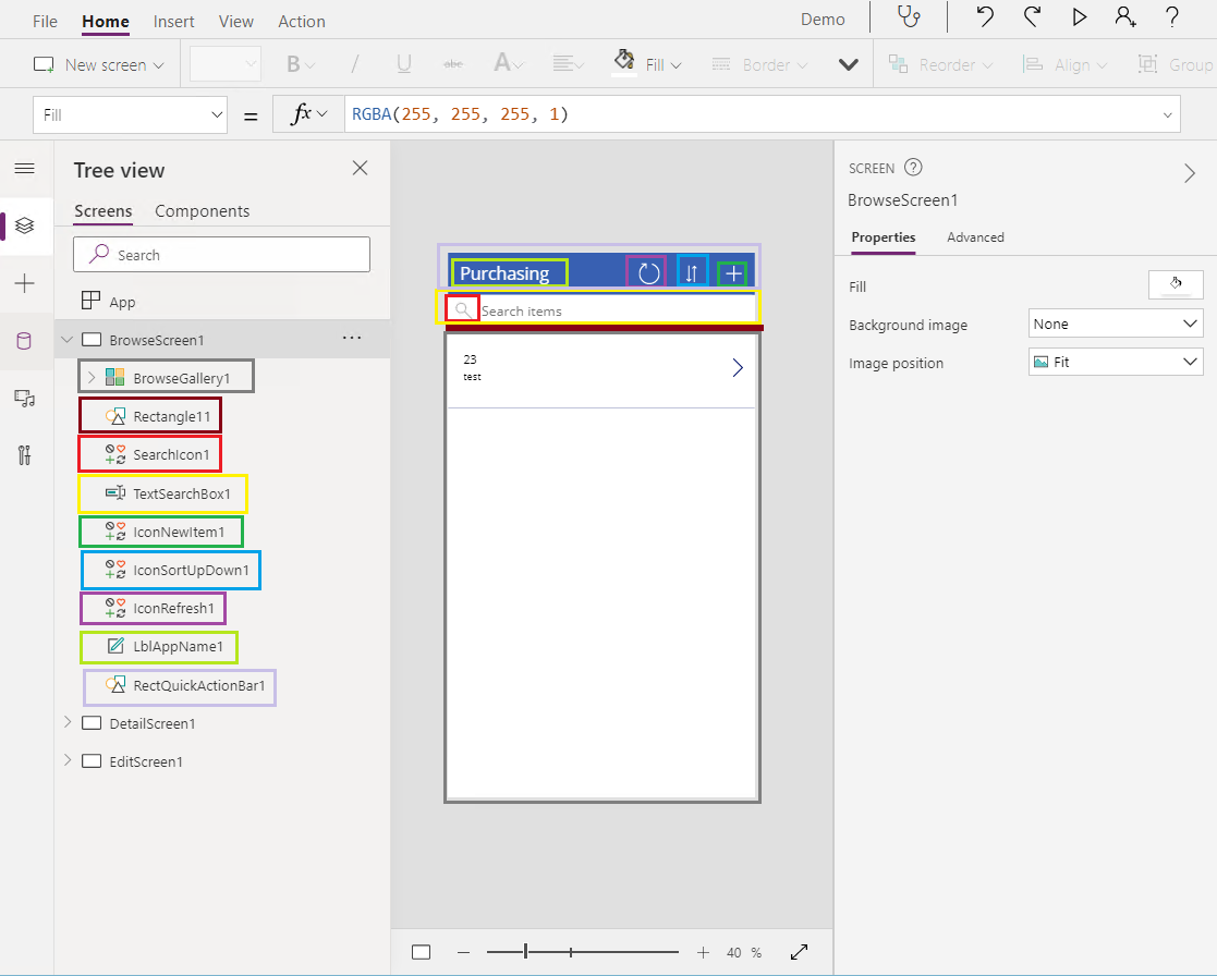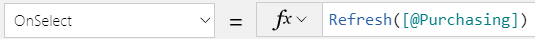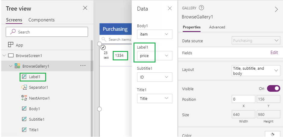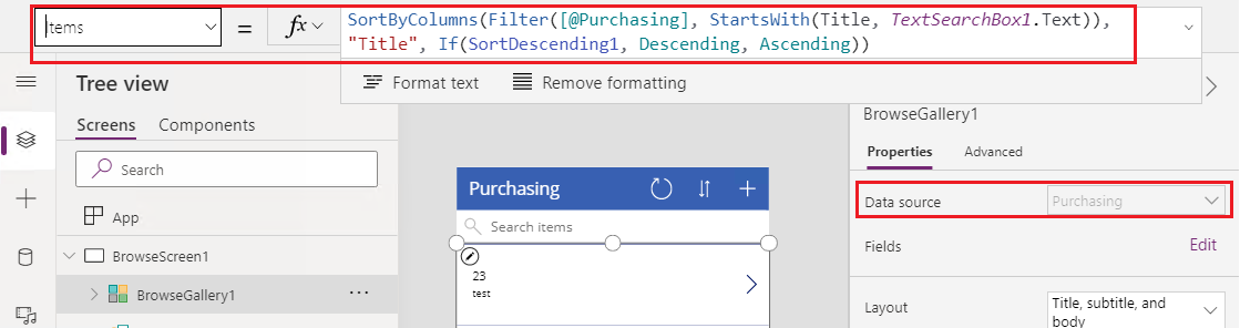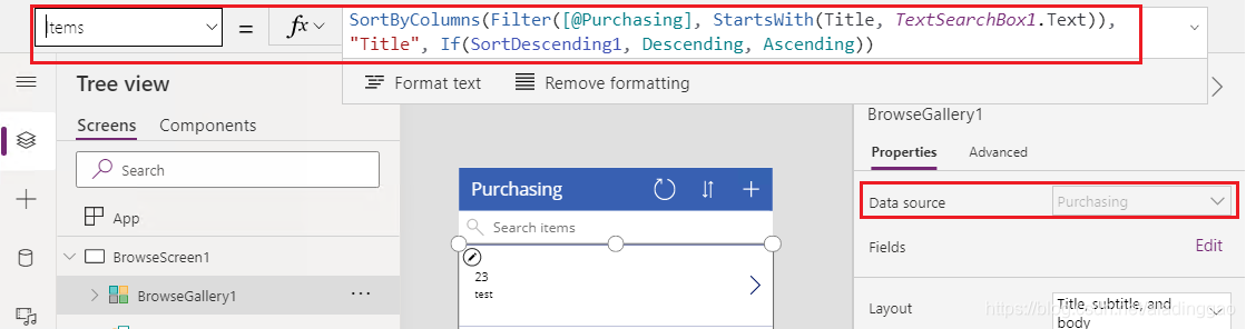 上面提到BrowseGallery1是用来显示 Sharepoint List 里的数据条目的,它是怎么关联到 List 的呢?点选中BrowseGallery1,有两个地方(下图红框标出的位置)可以看到数据源。一个是在右侧属性栏的Data source属性里, 另一个是在上面的 Items 属性里。这里的 Purchasing 就是存储在 Sharepoint list 里的一个列表名。