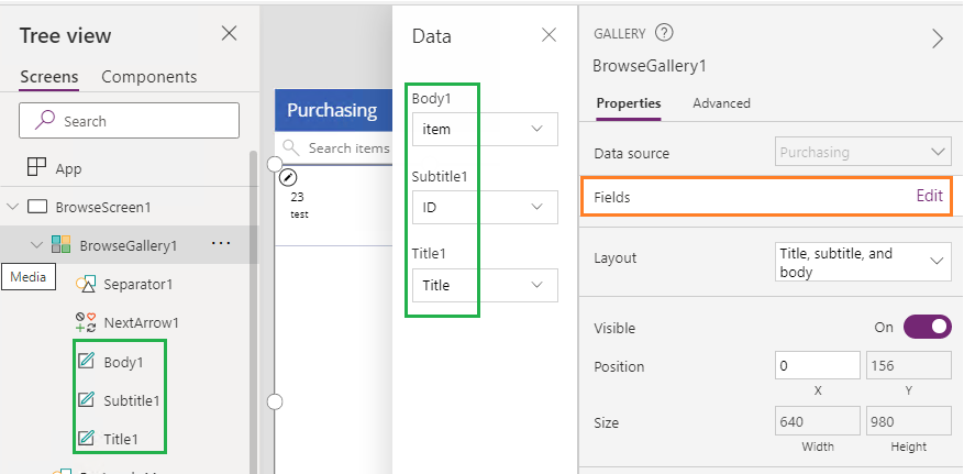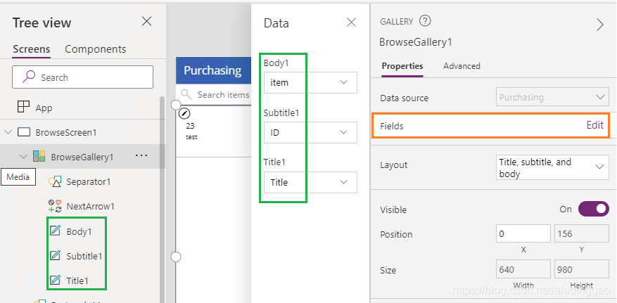 选择BrowseGaller1后,在右侧的属性栏里点Fields的 Edit按钮,可以看到当前选中了 List 里的三个字段 item、ID 和 Title(Title字段是创建SharePoint list 时自动生成的主字段), 这三个字段分别对应了BrowseGallery1下的三个Label 子控件,名称依次为Body1、Subtitle1 和 Title1。
