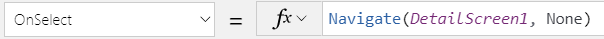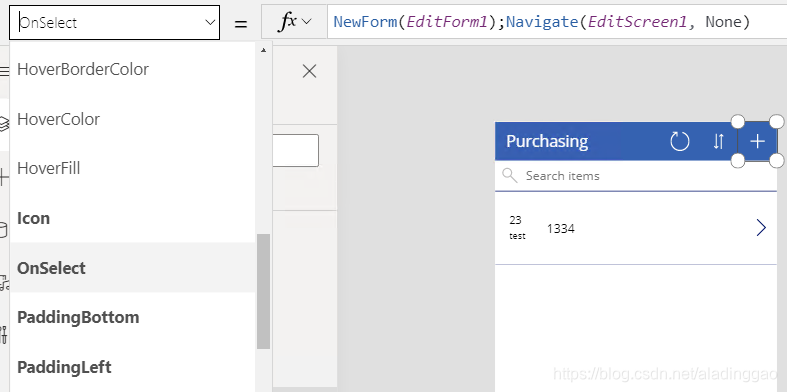 OnSelect表示点选按钮后要执行的动作,也就是点中按钮后,会执行 = 右边的函数命令。上面的OnSelect 设置为 = NewForm(EditForm1); Navigate(EditScreen1, None) 。从这个函数命令内容就能看出,点击 + 图标后,它会新建一个名为EditForm1的表单,然后跳转(Navigate)到EditScreen1这个页面。