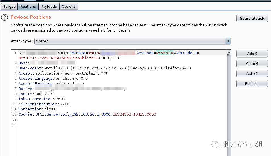 将发送短信验证码的报文发送到Intruder,因为我们只需要修改图形验证码的值即可,所以只留一个变量。