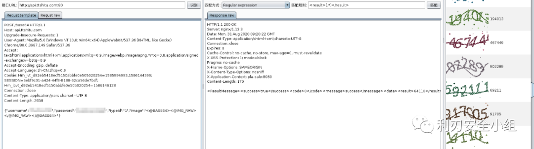 POST /base64 HTTP/1.1Host: api.ttshitu.comUpgrade-Insecure-Requests: 1User-Agent: Mozilla/5.0 (Windows NT 10.0; Win64; x64) AppleWebKit/537.36 (KHTML, like Gecko) Chrome/80.0.3987.149 Safari/537.36Accept: text/html,application/xhtml+xml,application/xml;q=0.9,image/webp,image/apng,*/*;q=0.8,application/signed-exchange;v=b3;q=0.9Accept-Encoding: gzip, deflateAccept-Language: zh-CN,zh;q=0.9Cookie: Hm_lvt_d92eb5418ecf5150abbfe0e505020254=1585994993,1586144399; SESSION=5ebf9c31-a424-44f8-8188-62ca56de7bdf; Hm_lpvt_d92eb5418ecf5150abbfe0e505020254=1586146123Connection: closeContent-Type: application/json; charset=UTF-8Content-Length: 2658{"username":"***","password":"***","typeid":"1","image":"<@BASE64><@IMG_RAW>@IMG_RAW>@BASE64>"}