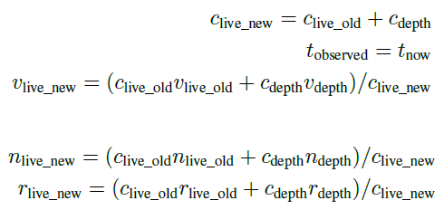 找到对应的实时面元后,通过以下公式把该像素u的深度面元融合到实时面元