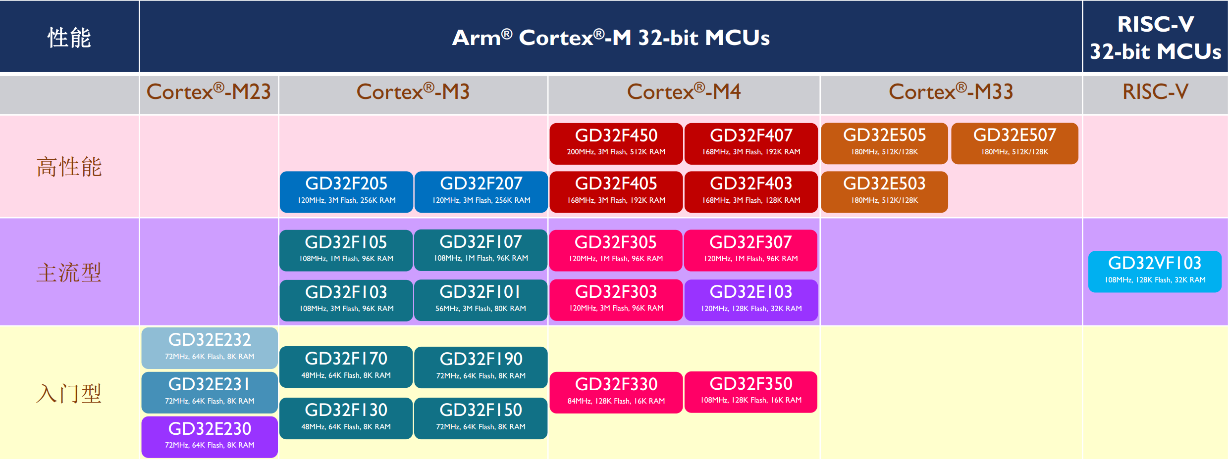 背景介绍:兆易创新2005年成立于北京, 目前在全球超1100名员工,2016年上海证券交易所成功上市 (SSE 603986),SPI NOR Flash领域全球排名第三 Flash累计出货超130亿颗,截止到目前32-bit ARM® Cortex® MCU 累计出货超5亿颗;目前兆易创新GD32产品线主要有以下的产品线,产品型号共计已经超过400+种,下图是MCU系列产品的Roadmap;