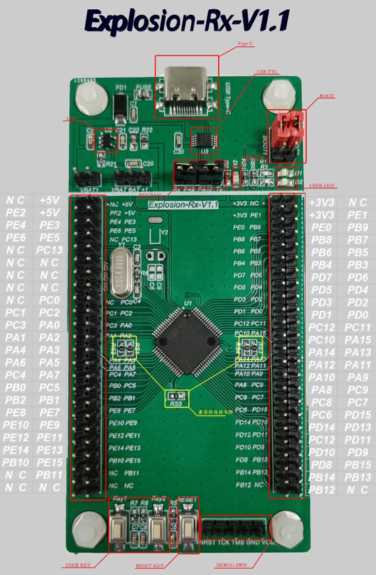由于不同的型号,引脚上需要做一定的兼容性设计,此兼容性设计可以覆盖到GD32所有系列LQFP-64封装的型号,评估板在兼容性设计上可谓下了很大的功夫。通过板载的RS1、RS2、RS3、RS4、RS5电阻【上图中黄色框框所示】的不同焊接选项即可实现,关于兼容性描述在评估板背面的丝印上也有明确的标出。
