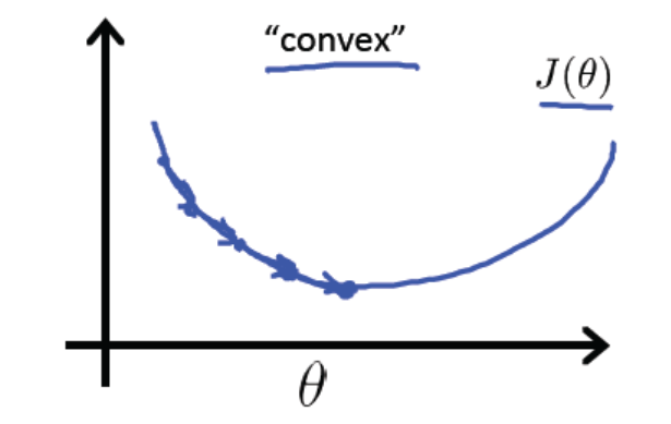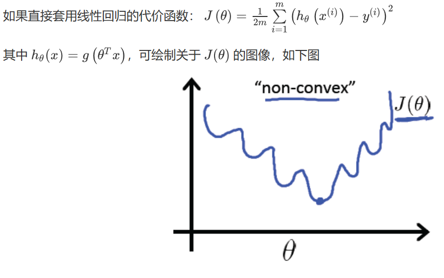 回忆线性回归中的平方损失函数,其是一个二次凸函数(碗状),二次凸函数的重要性质是只有一个局部最小点即全局最小点。而上图中有许多局部最小点,这样将使得梯度下降算法无法确定收敛点是全局最优(由于分类方法中h(x)是一个较复杂的函数,而非线性回归中的线性函数)。