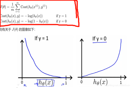 如左图,当训练集的结果为y=1(正样本)时,随着假设函数趋向于1,代价函数的值会趋于0,即意味着拟合程度很好。如果假设函数此时趋于0,则会给出一个很高的代价,拟合程度差,算法会根据其迅速纠正
