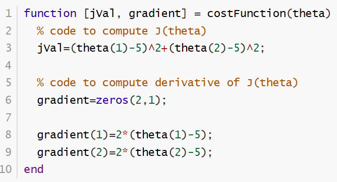 - 创建一个函数以返回代价函数及其偏导数(注意是偏导而非完整的