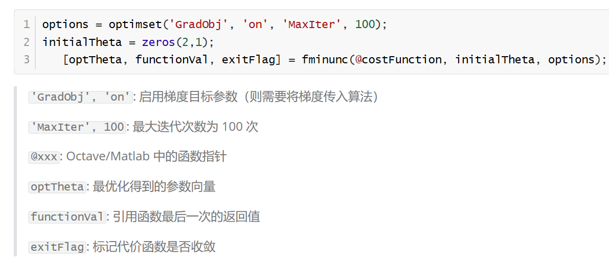 注意:fminunc函数的参数help fminunc命令随时查看函数的帮助文档。