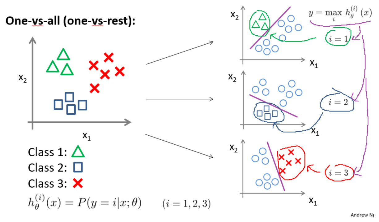 原理是,转化多类别分类问题为多个二元分类问题,这种方法被称为 One-vs-all。