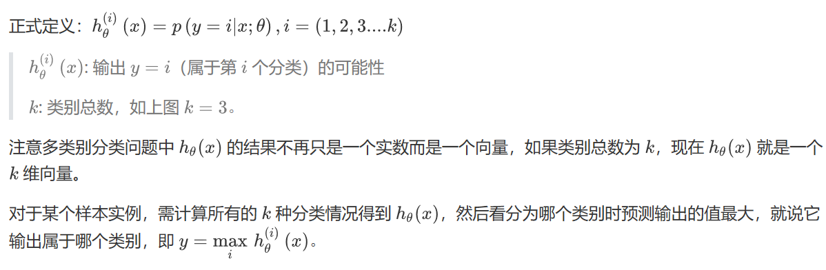 也就是说,对于一个输入x,判断其是哪一类(总共k类)。我们将把x分别带入k个假设函数,得到分别为这k个类别的概率,即为k维的