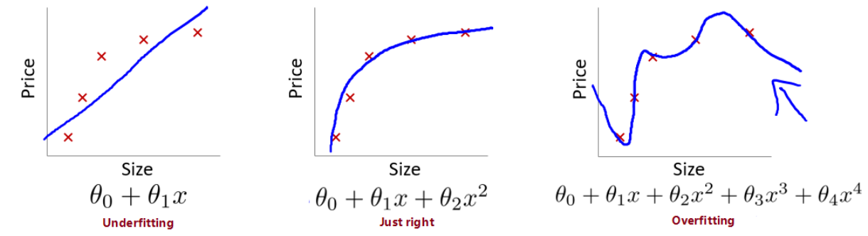 据上图,高偏差意味着欠拟合,高方差意味着过拟合。