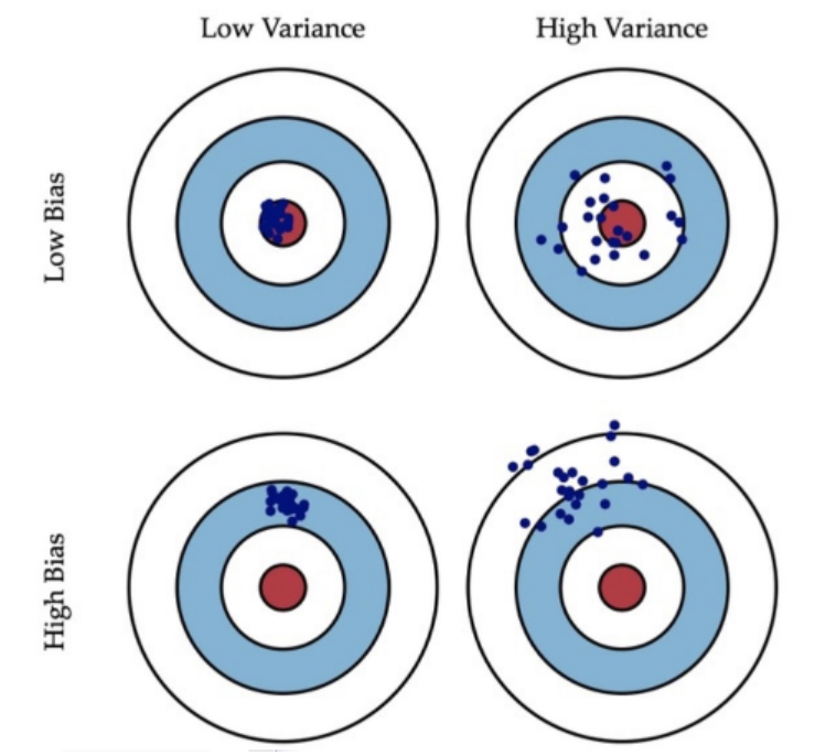 我们应尽量使得拟合模型处于低方差(较好地拟合数据)状态且同时处于低偏差(较好地预测新值)的状态。