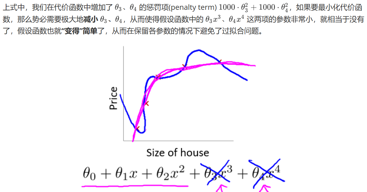 ,但是对于不在训练集中的新数据,预测值和实际值的误差会很大,泛化能力弱,这类情况被称为过拟合。拟合模型过于复杂(特征选多了)时易出现这类情况。类似于,你上课跟着老师做题都会都听懂了,下课遇到新题就懵了不会拓展。