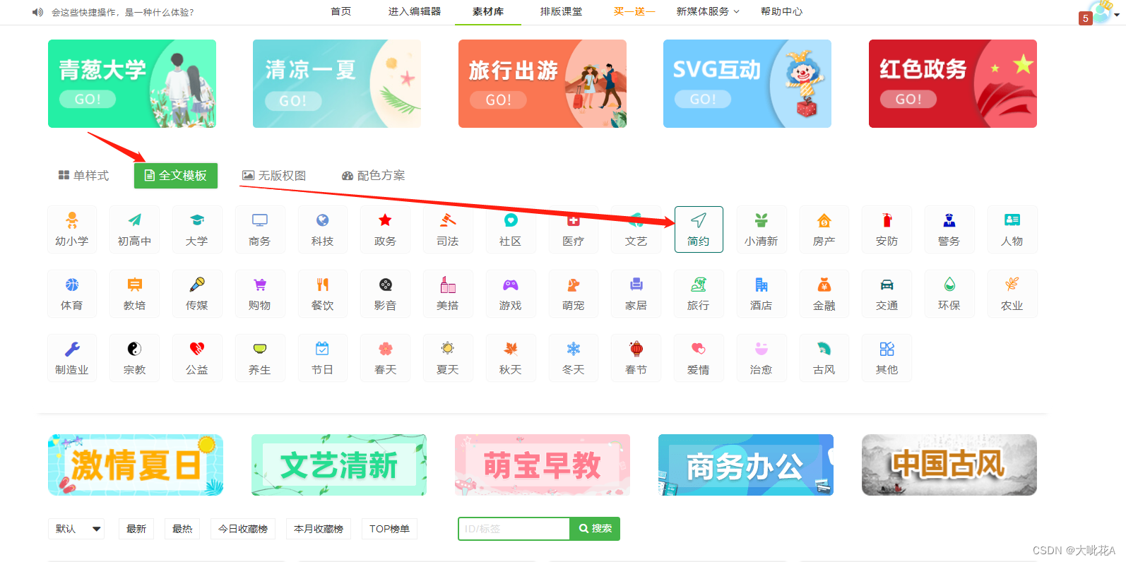 打开速排小蚂蚁微信编辑器点击全文模板,里面有很多领域、风格的模板,选择简约风格就出现了很多好看的极简风格全文模板哦!