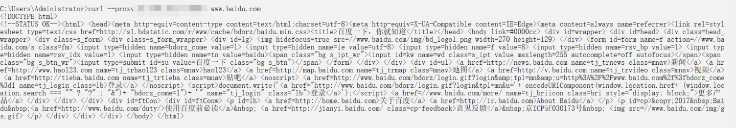 进行测试 C:\Users\Administrator>curl --proxy xx.xx.xx.xx:8888 www.baidu.com