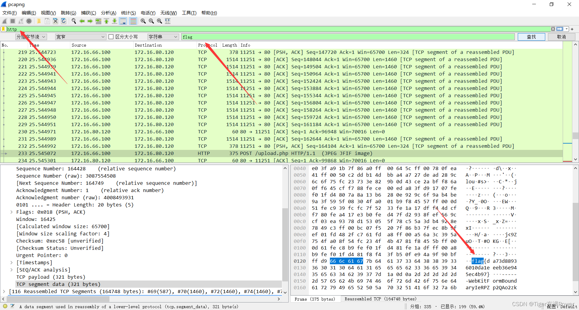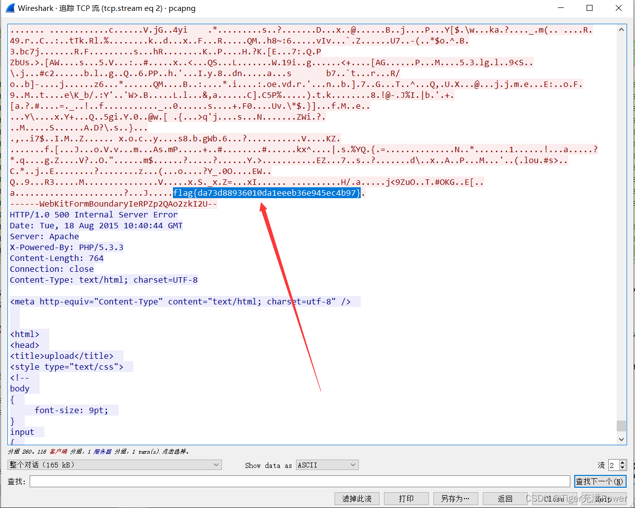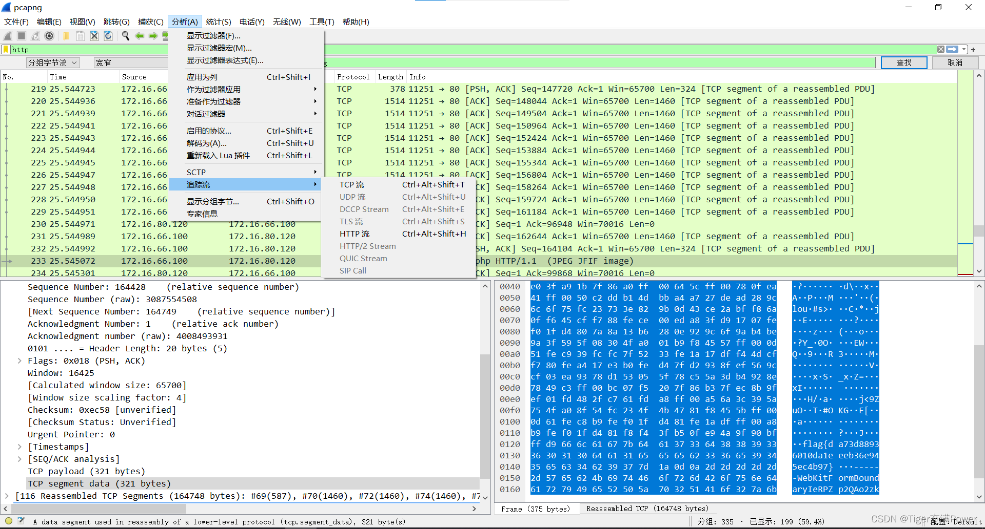 这里flag是找到了,可以通过下图这个追踪tcp流获取: