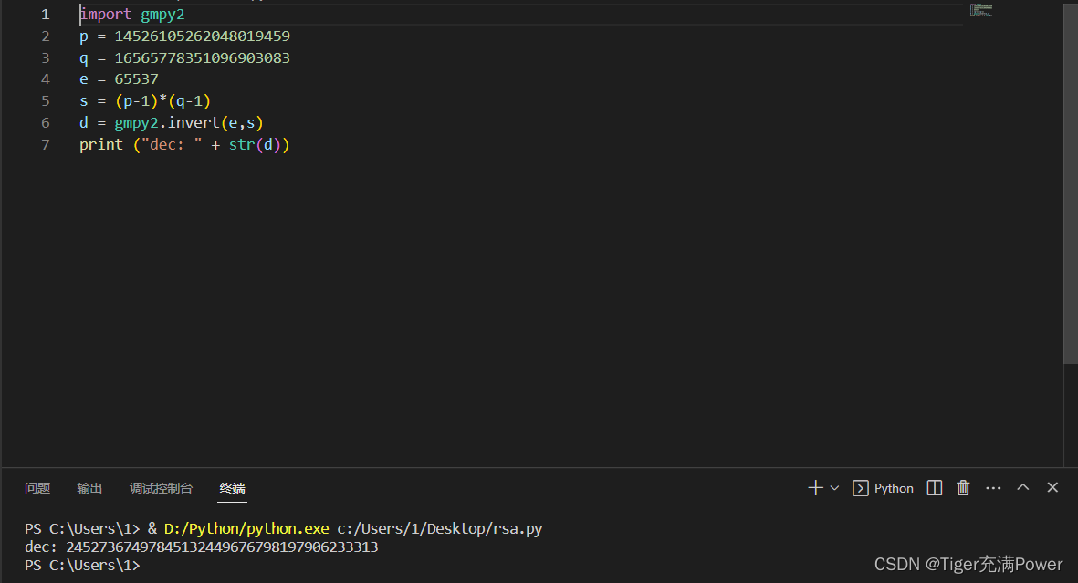 求d,这里用到python辅助计算,先安装 gmpy2 库,将pqe的值代入脚本