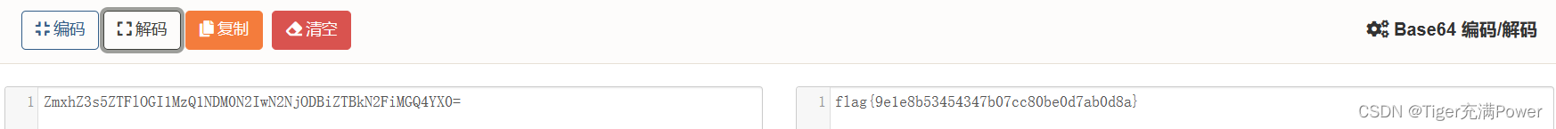 最后再进行base64解码即可:flag{19cb2eeae5c953a32fa873e0682ed330}