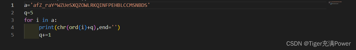 afZ_对应flag,他们每位字符分别向后偏移了5,6,7,8位,即5+n位,理解了题目,现借助python脚本来对这个字符串解码: