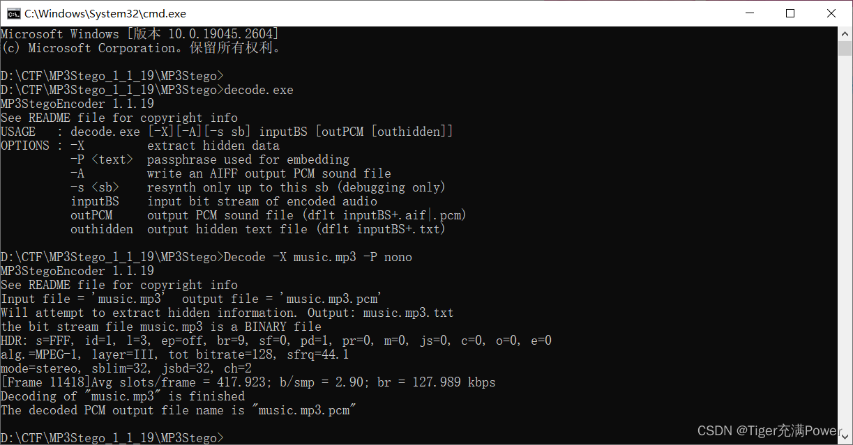 mp3格式,音频隐写,使用工具MP3Stego ,在文件所在位置打开cmd:
