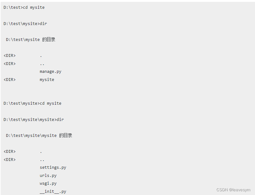 可以看到Django自动帮我们创建了一个mysite文件夹,这是项目的根目录。在mysite根目录中,又有一个mysite目录,这是整个项目的配置文件目录(一定不要和同名的根目录混淆),还有一个manage.py文件,它是整个项目的管理脚本。