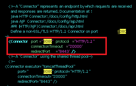 运行 vim server.xml,用“/8080”定位到8080端口。如下图: