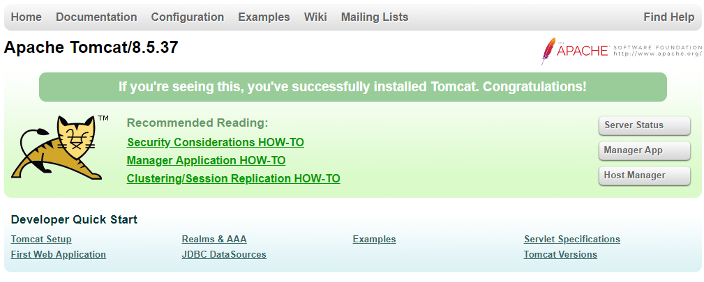 运行 /usr/local/tomcat8/bin/startup.sh 就会启动tomcat,在浏览器中访问http://localhost:8080了,能看到如下界面,说明访问成功。