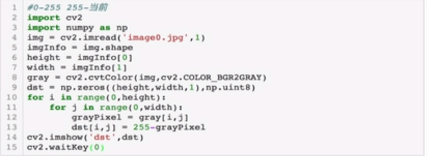 灰度图像的颜色反转,比较简单一点,因为它的颜色空间只有一层,只需要用255-mat[i,j](灰度图该点的像素值)存储到新的矩阵中即可。